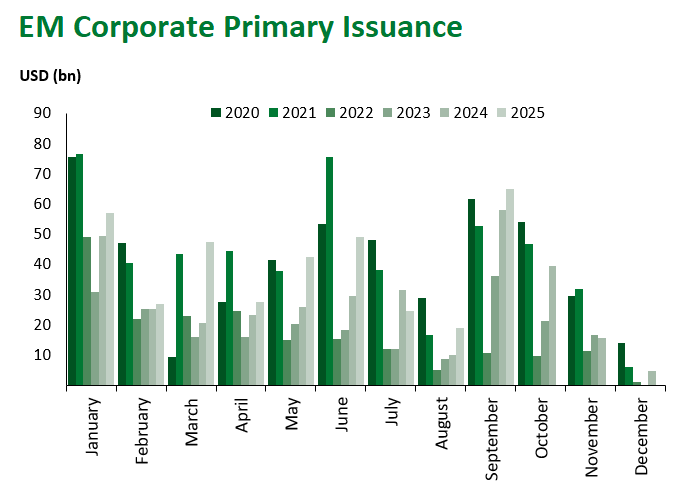 EM corporate debt posted a modest 0.11% gain for the week, with performance diverging across credit quality. Investment-grade corporates rose 0.31%, while high-yield names declined 0.17%. Index-level spreads widened by 6 bps, with high-yield spreads moving 8 bps wider vs. 4 bps for investment grade. Argentine corporates underperformed alongside sovereign weakness. Turkish corporate credit also came under pressure as liquidity concerns deepened. Bonds from companies like Wesoda and Vestel sold off on the back of political and credit-specific headlines, with Wesoda’s bonds falling sharply following the detention of a key shareholder amid a broader government crackdown. Vestel was downgraded by Moody’s to Caa1, which cited deteriorating liquidity and weak operating performance. Rising credit risk, foreign-exchange volatility, and macro pressures prompted investors to reduce exposure, particularly as Fitch highlighted weakening profitability and asset quality across Turkish banks. In contrast, Asia corporates, predominantly investment-grade, outperformed as continued demand for high-quality credit supported the segment.