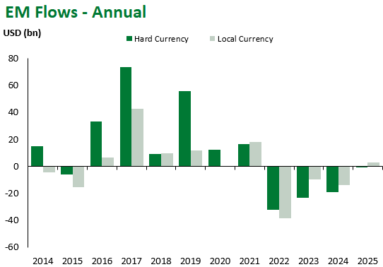 From a regional perspective, Africa outperformed, supported by broad-based gains across the continent. Ethiopia led returns as optimism grew around its external position, fueled by a sharp increase in export revenues from coffee and gold – both of which have doubled year-over-year. The stronger trade balance has bolstered investor confidence, despite the ongoing debt restructuring process. Mozambique also rallied after JPMorgan removed it from its list of high-risk sovereigns, citing improved debt sustainability and a narrowing risk premium. The upgrade, alongside stable inflation and record-high domestic credit growth, contributed to a more constructive macroeconomic outlook.