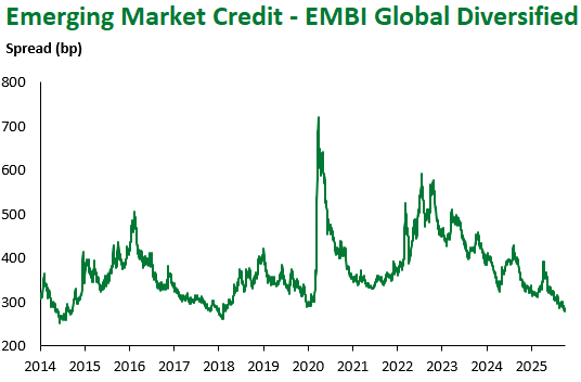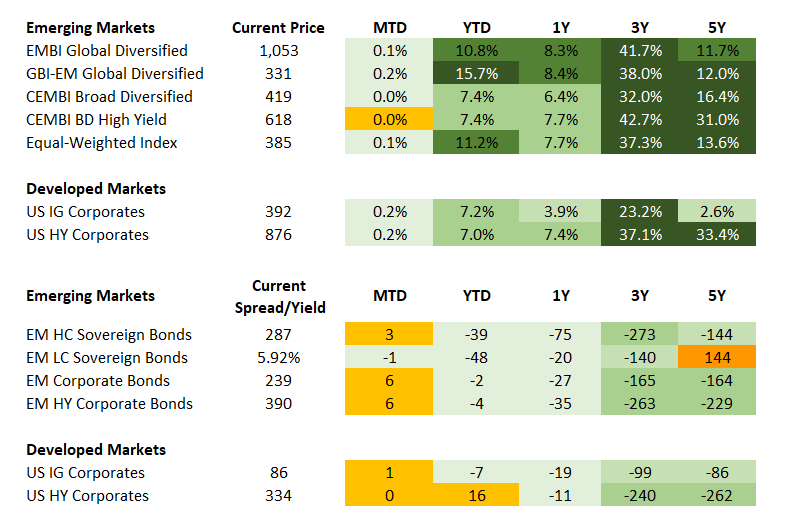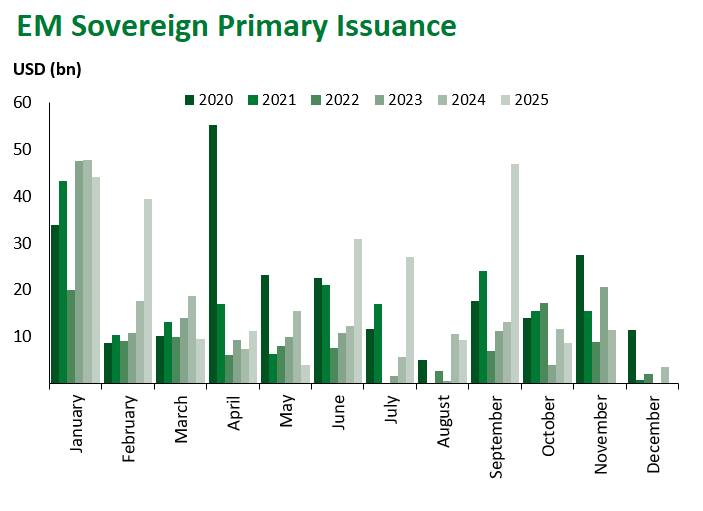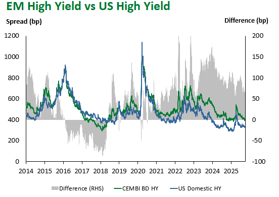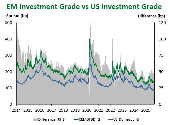 Local-currency debt returned 0.29%, supported by a pullback in the U.S. dollar. Indonesia, Hungary, and Peru outperformed, benefiting from favorable rate dynamics and improving domestic sentiment. In contrast, the Dominican Republic and Thailand lagged, with the former under pressure from weaker growth data and the latter weighed down by political uncertainty and rising oil prices, as well as by strong signaling by the Thai central bank on preference for a weaker currency.