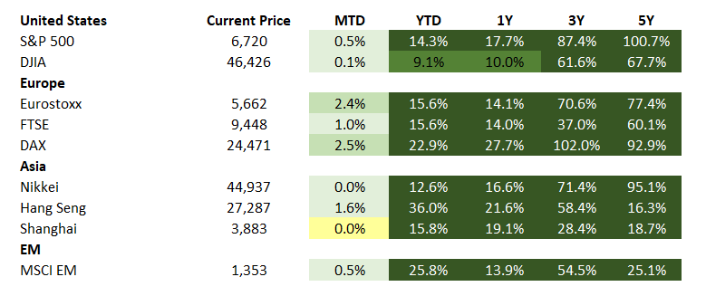 Given that context, markets were mostly mixed and in a wait-and-see pattern. U.S. Treasury yields edged lower, with the 10-year and 30-year around 5 bps lower to around 4.1% and 4.7%, respectively. The dollar was under pressure for most of the week due to the shutdown, but recovered some lost ground and finished largely unchanged around 98 on the DXY. Brent and WTI prices extended their slide back to $65 and $60, respectively, amid expectations that OPEC+ will agree on additional supply over the weekend and potential fast-track production hikes in 2026. Gold posted a new high, $3,900 per ounce, as investors continued to seek inflation protection and portfolio hedging – but closed the week slightly off the high.