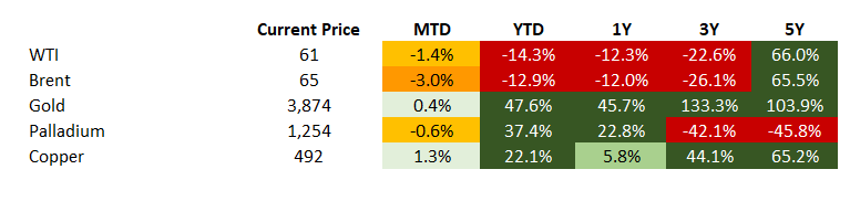 Source for data tables: Bloomberg, JPMorgan, Gramercy. EM Fixed Income is represented by the following JPMorgan Indicies: EMBI Global, GBI-EM Global Diversified, CEMBI Broad Diversified and CEMBI Broad High Yield. DM Fixed Income is represented by the JPMorgan JULI Total Return Index and Domestic High Yield Index. Fixed Income, Equity and Commodity data is as of Oct. 3, 2025 (mid-day).