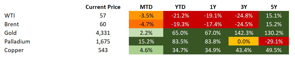 Source for data tables: Bloomberg, JPMorgan, Gramercy. EM Fixed Income is represented by the following JPMorgan Indicies: EMBI Global, GBI-EM Global Diversified, CEMBI Broad Diversified and CEMBI Broad High Yield. DM Fixed Income is represented by the JPMorgan JULI Total Return Index and Domestic High Yield Index. Fixed Income, Equity and Commodity data is as of Dec. 19, 2025 (mid-day).