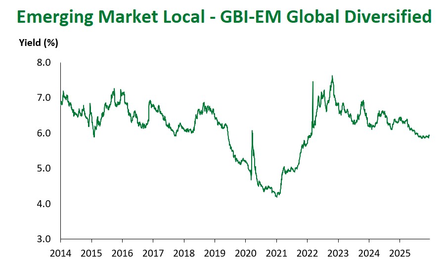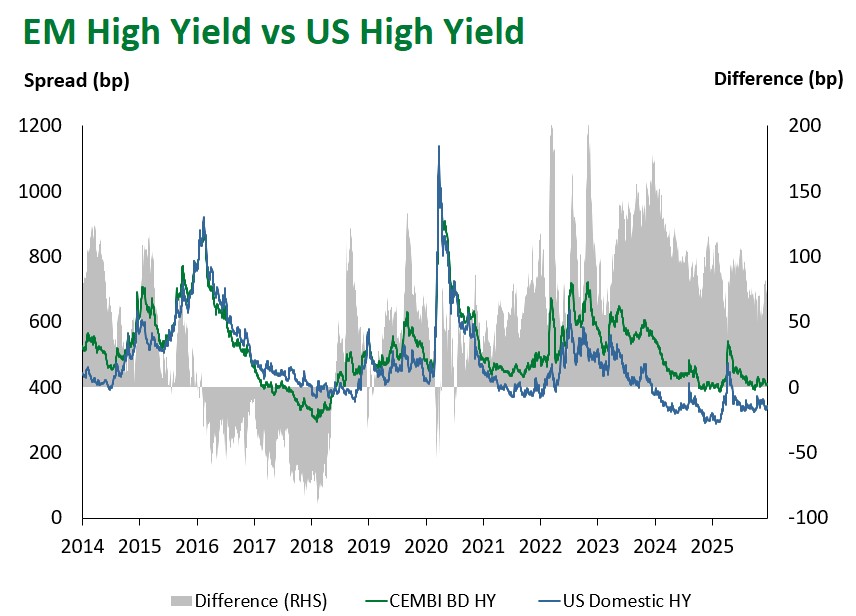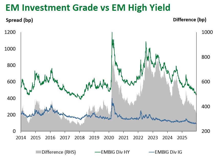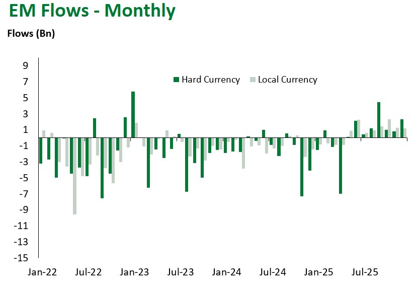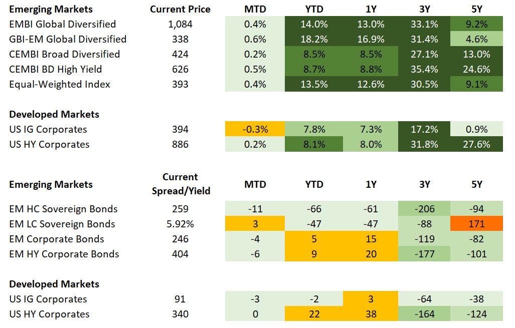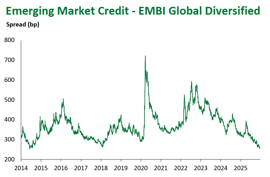 Emerging Markets (EM) fixed income delivered solid results this week. EM hard-currency sovereigns posted moderate gains, returning 0.30%, bringing year-to-date performance to 13.97%. High-yield bonds (0.37%) outpaced investment grade returns (0.23%). Spreads widened 4 bps at the index level, with investment grade and high-yield sub-components 5 bps and 3 bps wider, respectively.