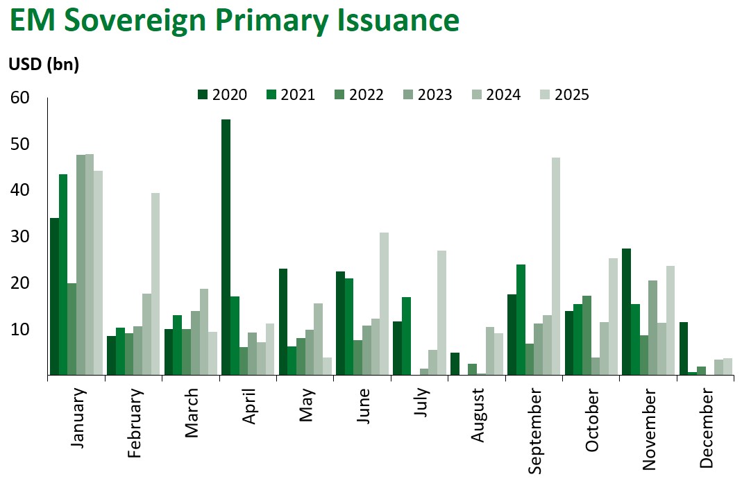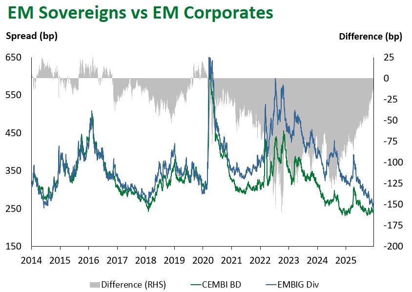 EM corporates gained 0.22%, with high yield slightly outperforming investment grade (+0.24% vs. +0.2%), bringing year-to-date performance to +9.48%. Regionally, Asia (+0.28%) and Europe (+0.24%) outperformed, while Latin America lagged (+0.17%). Returns were broad based across maturities. By rating, the ‘C’ bucket led (+1.04%) gains, whereas BB and A (+0.18%) components lagged. Corporate spreads widened modestly by 5 bps at the index level.