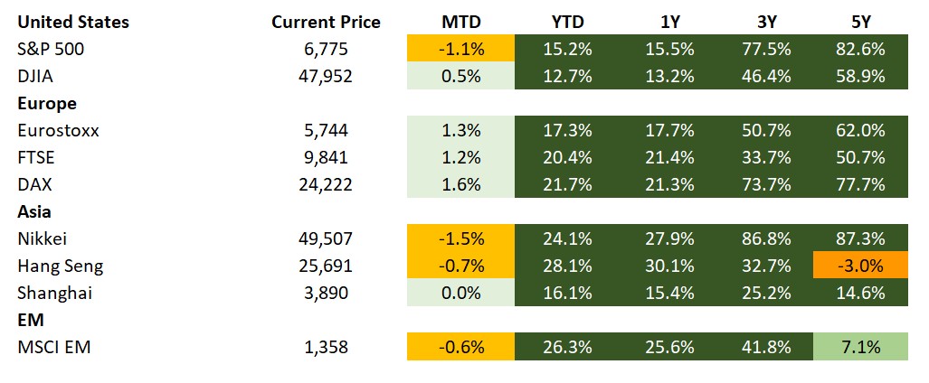 Against this backdrop, earlier declines in stock markets on concerns over AI data center spending reversed. The S&P 500 halted a four-day slide and the tech-heavy Nasdaq was further supported by an upbeat outlook from Micron Technology Inc. Nevertheless, U.S. equity markets still closed lower on the week. Treasury yields finished around levels where they started: 4.15% and 4.82% for the 10-year and 30-year, respectively. The dollar was little changed, closing the week marginally stronger, slightly above 98.5, on the DXY; Bitcoin experienced similar dynamics, remaining below $90,000, around $40,000 off its peak. Oil prices continued to slide, with Brent struggling to hold $60 per barrel and WTI dropping to the mid-$50s. Despite softer-than-expected November U.S. inflation data, gold held firm around $4,300/oz and silver rallied further.