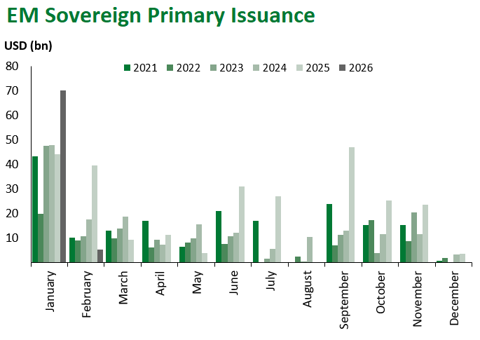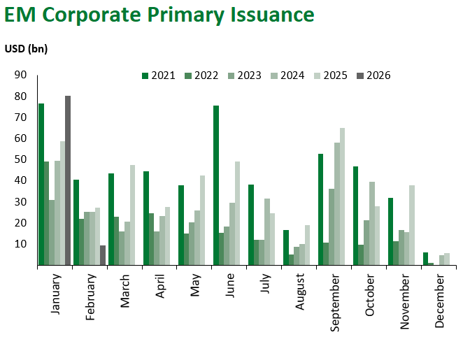 Primary market activity eased after the January deals deluge, with 24 hard-currency issuers coming to market this week. Only three sovereigns were among them: Türkiye with a EUR-denominated issuance, Korea with a USD-denominated, and Poland with a JPY-denominated one. Corporate issuance was balanced across regions and ratings.