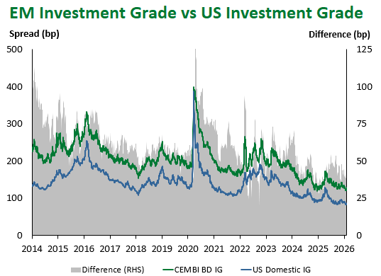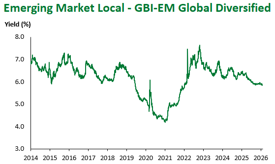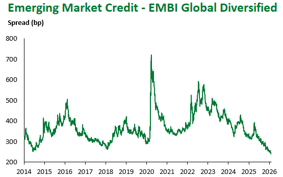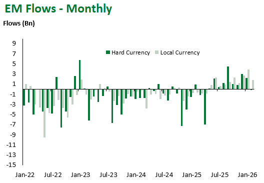 Emerging Markets (EM) fixed income delivered mixed results this week, with local-currency debt, the best performing sub-asset class YTD, underperforming this week amid slight USD recovery. Colombia (-1.93%) and Poland (-1.21%) were down as political risks combined with BanRep’s hawkish shift in Colombia, while the Polish central bank signaled it might soon resume rate cuts. The main outperformer this week was India (+2.12%) on constructive trade developments amid trade deals with the EU and the Trump administration.