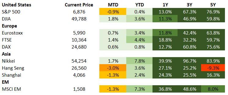 Metals markets remained highly volatile: after last week’s 20% peak to bottom move, spot gold initially climbed back to above $5,000 per ounce but gave up some gains to finish the week just below the $5,000 mark. Spot silver’s volatility was even greater, closing in the mid-$70s per ounce, which is almost 40% lower from its peak reached last week. The dollar strengthened, recovering to the mid-97s on the DXY from its multi-month low of below 96 reached last week. Oil prices edged lower compared to last week to mid and low-60s for Brent and WTI, respectively as Iran and the U.S. appeared to look for a diplomatic solution to avoid a potential major military escalation in the Middle East. Crypto assets sold off sharply but also rebounded as Bitcoin closed around the high-60,000s, almost 50% below its October 2025 peak.