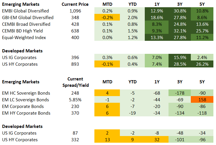 Hard-currency sovereigns posted modest gains, returning +0.18%, driven by high yield (+0.24%), which outperformed investment grade (+0.12%). All EM regions delivered positive returns with the Middle East leading (+0.30%) and Asia lagging (+0.11%). At the country level, Senegal led gains (+5.26%) on speculation of positive news from the IMF’s recent visit, while the distressed stories in Venezuela (+2.26%) and Lebanon (+1.96%) outperformed as investors remain optimistic on recovery prospects. On the opposite end of the spectrum, El Salvador (-1.34%), Argentina (-0.76%) and Ukraine (-0.61%) underperformed. In El Salvador, frictions resurfaced between the authorities and IMF over the country’s Bitcoin purchases, Argentina gave back some of the gains from last week, and Ukraine saw limited progress in diplomatic efforts to end the war with Russia.