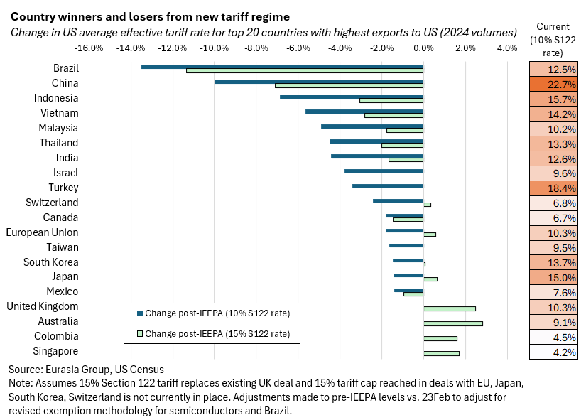 Brazil and China stand to benefit the most, given their prior exposure to the highest IEEPA-related tariffs. Southeast Asian economies also benefit, as recently negotiated tariff frameworks were set at levels above the new global baseline. In Brazil, exports to the U.S. that were not part of the prior framework’s extensive exemptions (around 20% of Brazil’s total goods exports to the U.S.) will now face a much lower 15% levy compared to 50% previously. All else equal, this is naturally a positive development from Brazil’s perspective that reduces the erosion of relative competitiveness for a segment of its exports to the U.S. However, as we’ve argued previously, for Brazil’s large and domestically driven economy, the overall macro impact of trade relations with the U.S., either in a positive or negative direction, is likely to remain relatively muted. In China, recent developments are unlikely to alter President Donald Trump’s planned trip to Beijing from March 31–April 1 or Trump’s desired deliverables from the visit, including potential purchase agreements. Although China’s relative advantage may narrow if new sector- and product-specific tariffs are introduced, we do not expect Beijing to retaliate, as overall tariff levels are likely to remain below prior IEEPA thresholds.