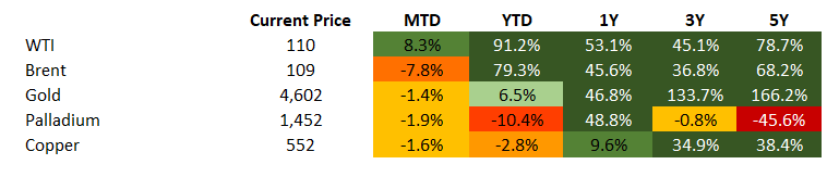 Oil prices traded in the $100- $110/bbl range with intra-week volatility and narrowing in the gap between WTI and Brent. The S&P 500 posted gains, while the U.S. 10-year yield declined to 4.3% mid-week from 4.4% the prior week. The U.S. Dollar Index continued to trade around 100, and gold recovered part of its recent losses.