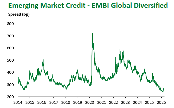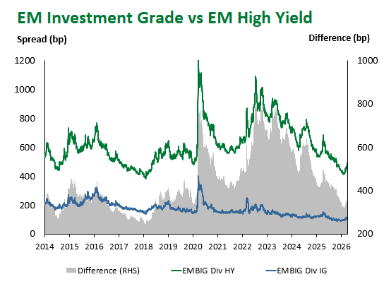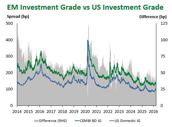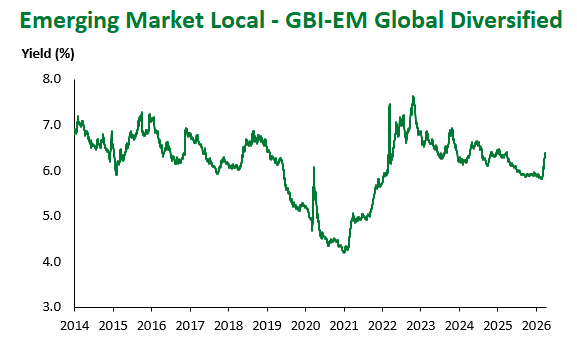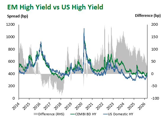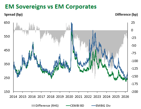 Through Wednesday, local currency sovereign debt was the standout performer, rising +1.26% as U.S. dollar strength eased and external conditions turned more supportive. At the country level, Hungary (+4.16%) and South Africa (+3.26%) outperformed. Hungary rallied on rising expectations of political change, with increasing signs that Viktor Orbán’s 16-year rule may be approaching an inflection point, while South Africa benefited from improving sentiment around a potential de-escalation in the Iran conflict – an outcome that would disproportionately ease pressures on its energy import-dependent economy. In contrast, Colombia (-0.70%) lagged as the Minister of Finance protested Banrep’s rate hike.