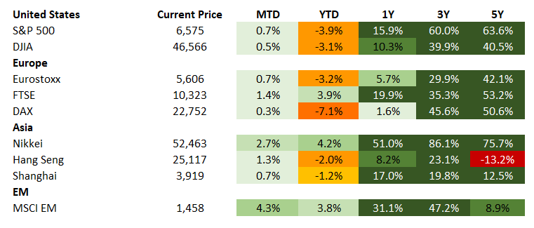 EM corporates also delivered positive, albeit more modest, returns, with the index up +0.43% through Wednesday. Performance across investment grade (+0.45%) and high yield (+0.40%) was broadly in line, mirroring the pattern in sovereigns. Regionally, Asia (+0.39%) outperformed as a more rate-sensitive segment of the market, while Africa (+0.16%) posted gains and other regions were largely flat. By rating, the AAA bucket outperformed (+0.46%), while the C-rated segment lagged (-0.51%) amid continued weakness in Ukrainian credits.