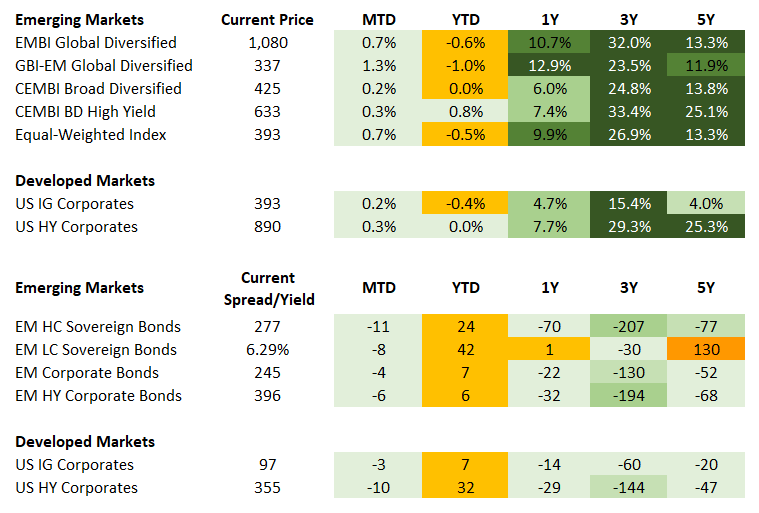 Hard currency sovereign bonds were up +0.95% at the index level through Wednesday, with gains broadly shared across investment grade (+0.92%) and high yield (+0.97%). This balance was also evident regionally, where higher beta Africa (+1.23%) and lower beta Asia (+1.12%) led performance, while the Middle East (+0.26%) lagged amid lingering uncertainty.