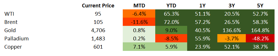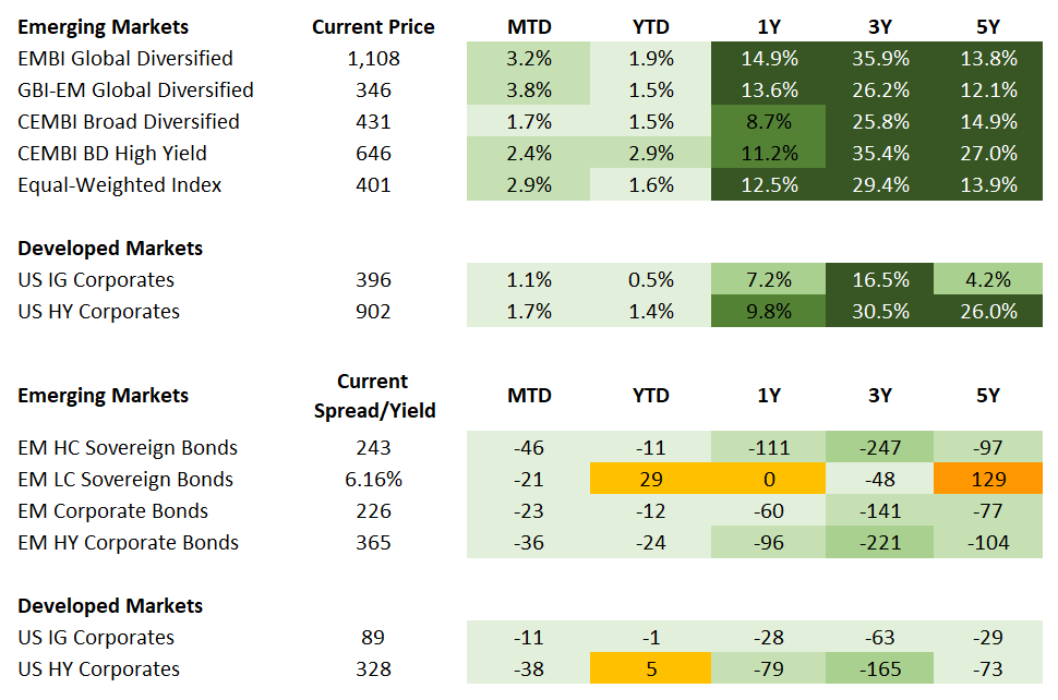 Source for data tables: Bloomberg, JPMorgan, Gramercy. EM Fixed Income is represented by the following JPMorgan Indicies: EMBI Global, GBI-EM Global Diversified, CEMBI Broad Diversified and CEMBI Broad High Yield. DM Fixed Income is represented by the JPMorgan JULI Total Return Index and Domestic High Yield Index. Fixed Income, Equity and Commodity data is as of Apr. 24, 2026 (mid-day).