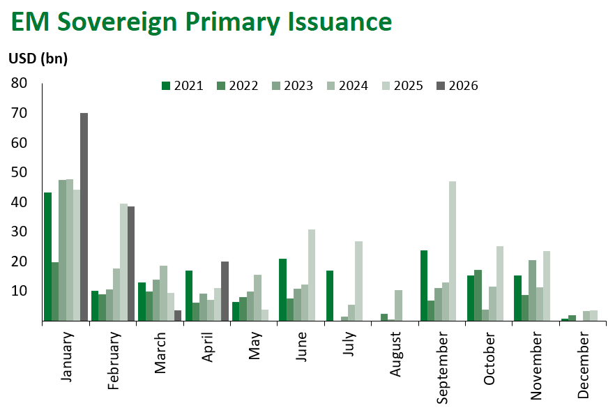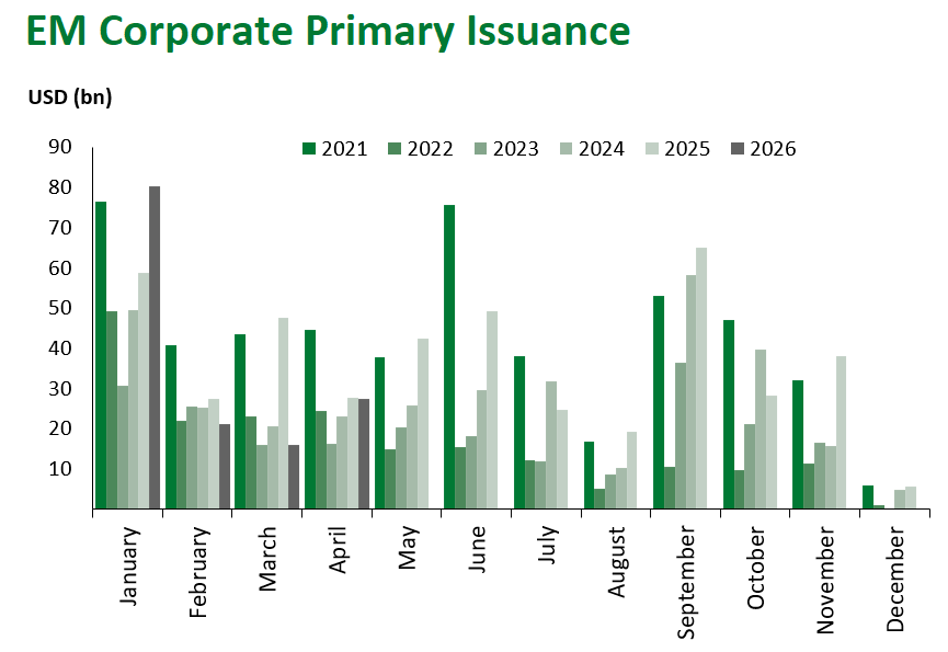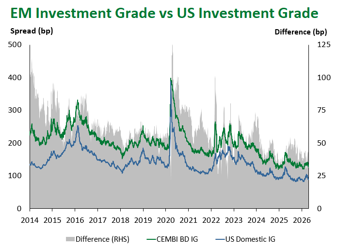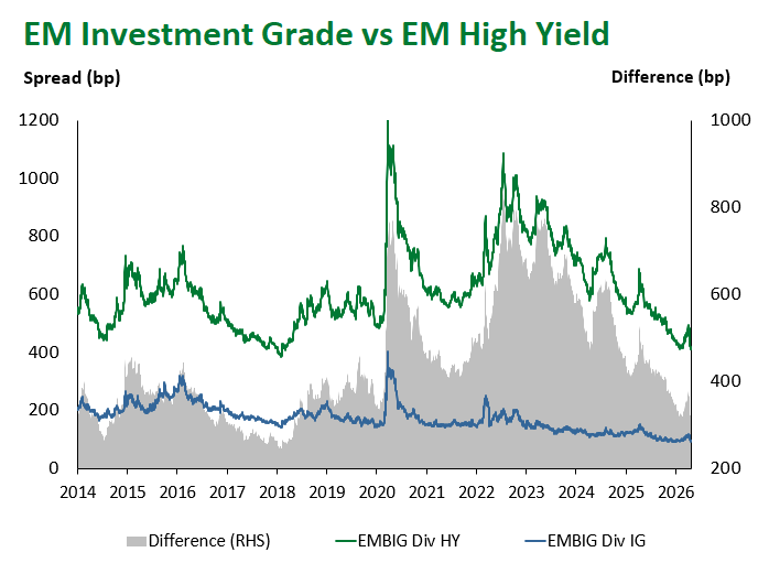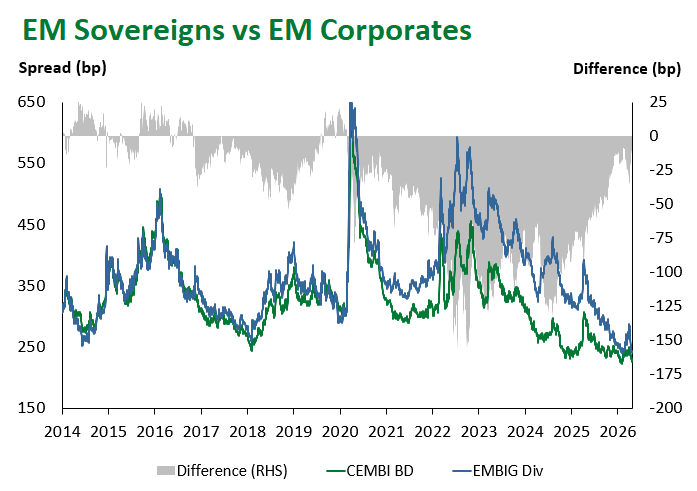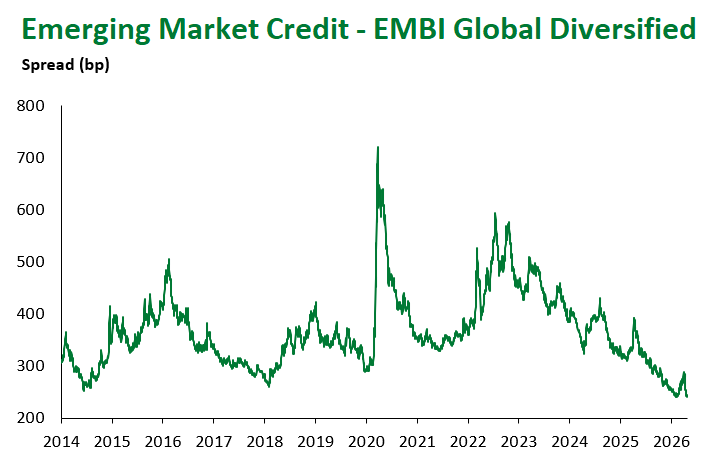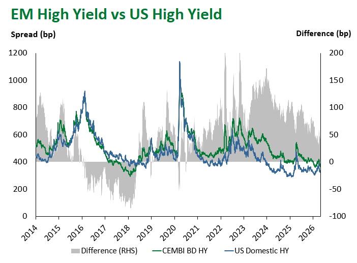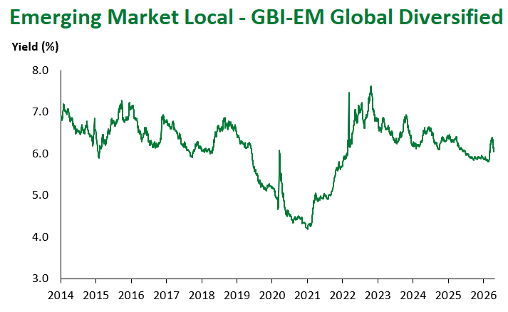 Emerging Markets (EM) fixed income came under broad-based pressure this week, reversing a portion of last week’s ceasefire-driven rally as the durability of the Iran-U.S. truce remained in question and risk sentiment softened across global markets. Local currency sovereign debt was the clear underperformer, while hard currency corporates proved the most resilient sub-asset class.