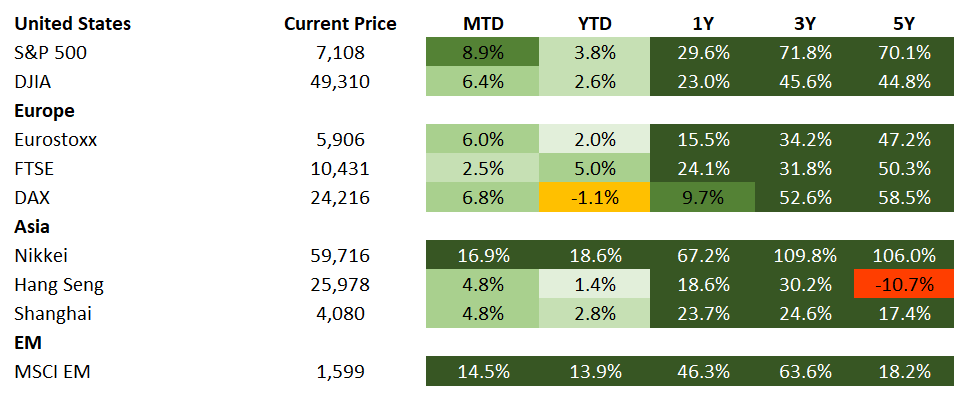 Beyond geopolitical developments, focus this week was also on Kevin Warsh’s confirmation hearing to lead the Federal Reserve where Mr. Warsh sought to dispel concerns that he would favor politically motivated interest rate cuts. Markets are currently pricing that the Fed will remain on hold for the rest of 2026.